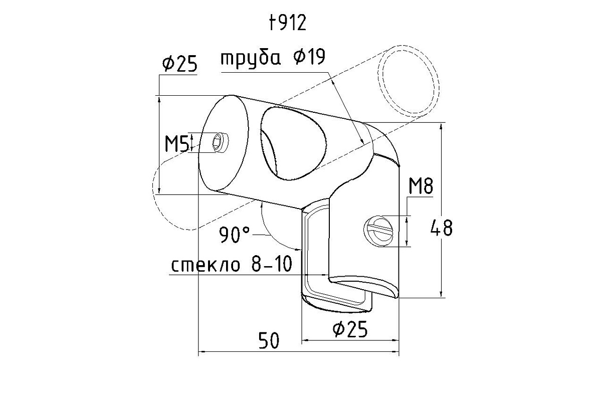 Коннектор предназначен для крепления круглой трубы 19 мм к стеклу в горизонтальной ориентации параллельно стеклу, при монтаже штанг верхней обвязки душевых кабин.