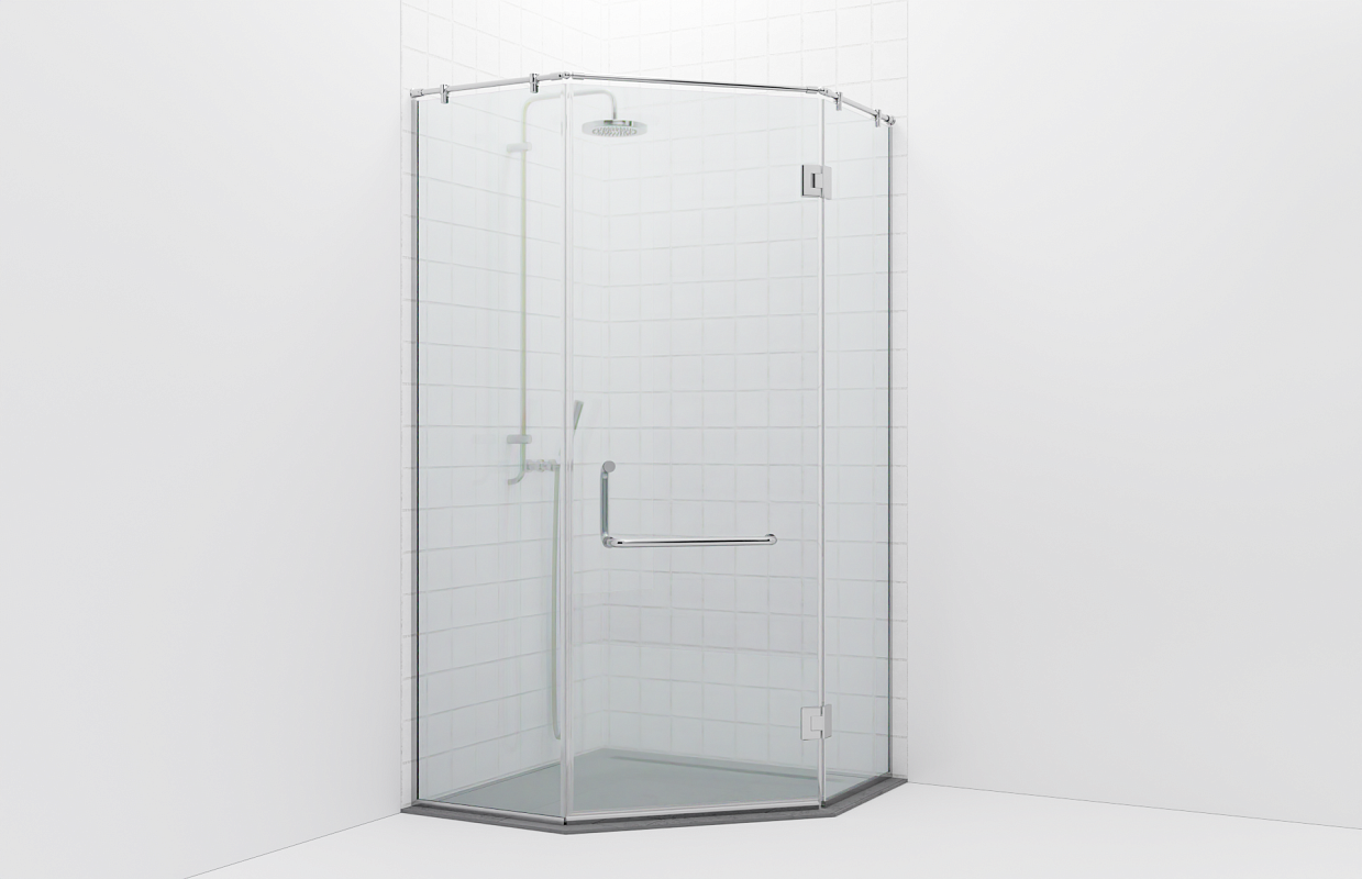 Комплект фурнитуры для трапециевидной угловой душевой, с распашной дверью на двух петлях. Стекло устанавливается на опорный профиль, сверху фиксируется круглой трубой (штангой). Герметичность душевой перегородки обеспечена уплотнителями. Стекло в комплектацию не входит.