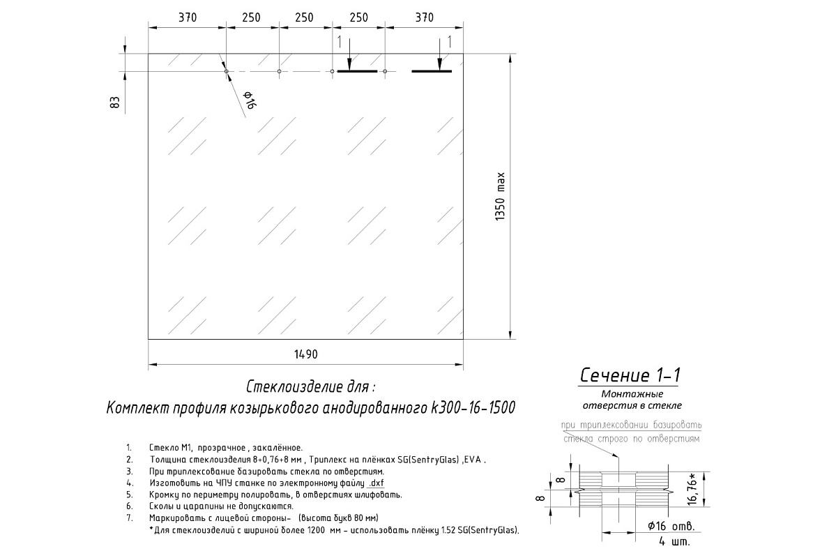 Требуются отверстия в стекле. Перед тем как сверлить отверстия в стекле, необходимо установить стекло в профиль, наметить отверстия, затем просверлить по отметкам. Стекло закаливается после сверления отверстий.