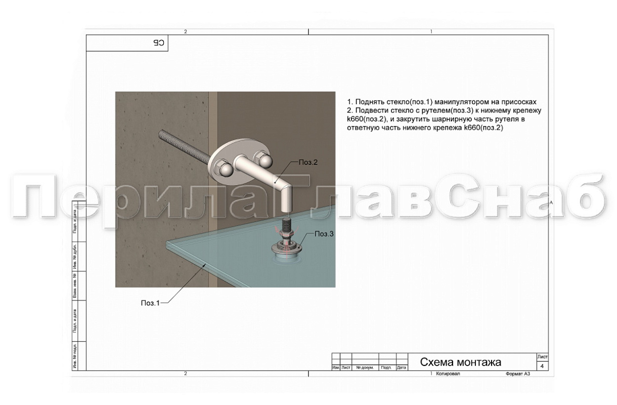 Рутель крепится к стеклу, затем монтируется на спайдер или вантовое крепление. Используется с деталями, имеющими резьбу M14. Со спайдерным креплением k663. С креплением стена-стекло k660. При вантовом креплении козырька с "серьгой" k659. В качестве альтернативы можно использовать рутель k634 или другие рутели.