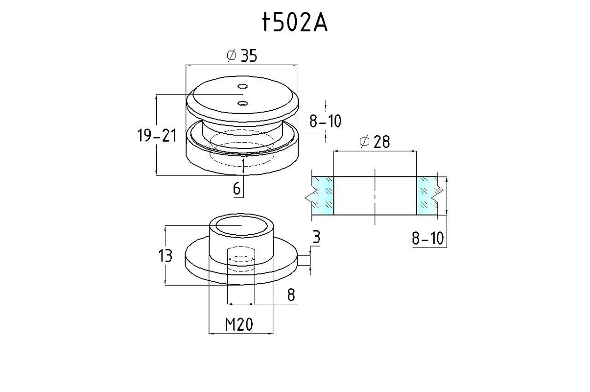 Точечный стеклодержатель 8.5-10.5 мм, регулируемый, без зенковки, для стекла 8-10 мм t502A SSS