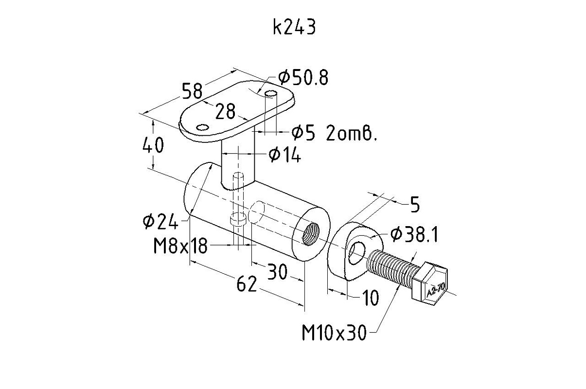 Держатель поручня к стойке диаметром - 38.1 мм, с ложементом для трубы диаметром 50.8 мм. Деталь полированная, литая. Марка стали - AISI 304
