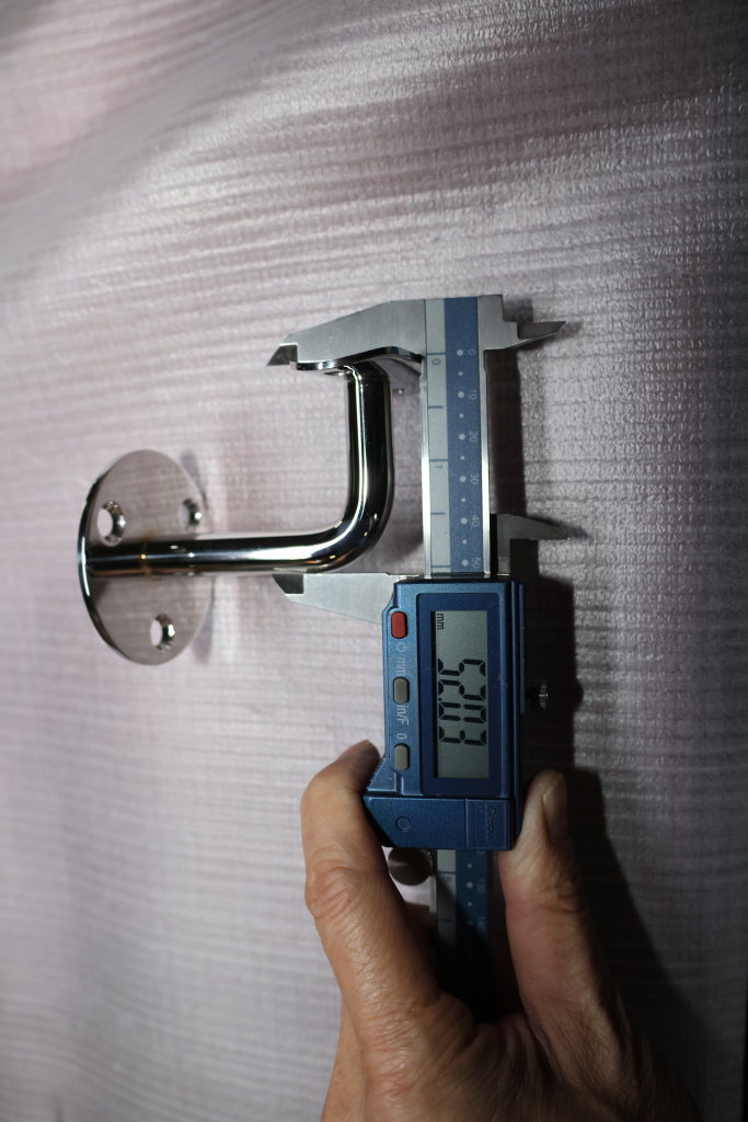 Благодаря оптимально подобранному выносу, пристенный поручень достаточно удален от поверхности стены, чтобы не задевать скользящей вдоль трубы поручня рукой идущего по лестнице человека. Но при этом поручень располагается близко к стене, дабы не сужать свободное пространство полезной ширины лестничного марша. Габариты: вынос 70х45 мм, Ø60х3мм, ложемент 25 х 45 х 2 мм