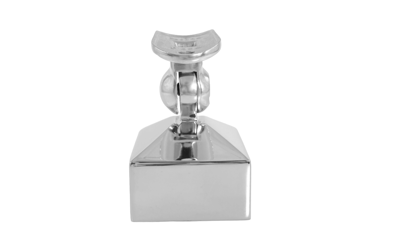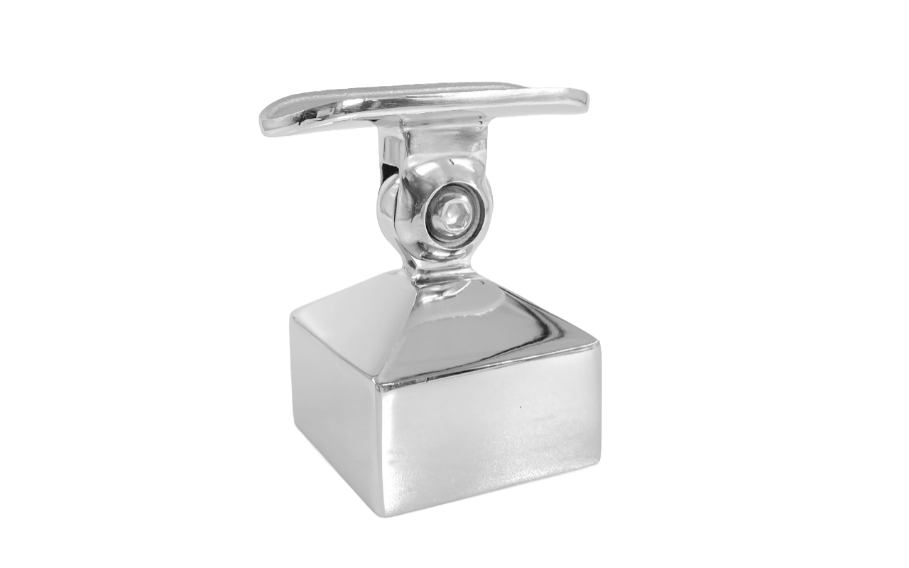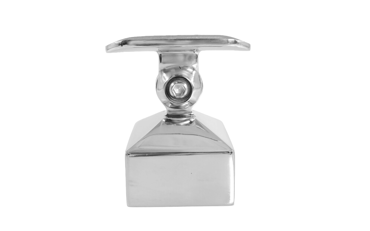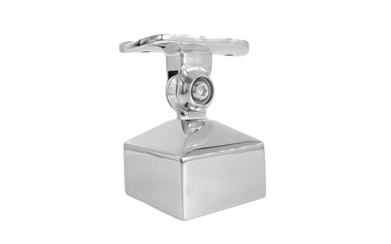 Наконечник на стойку 40х40 мм внешний полированный, с ложе под Ø50.8 мм. Деталь с регулируемым ложементом, что позволяет монтировать её как и на горизонтальных площадках, так на лестничных маршах.