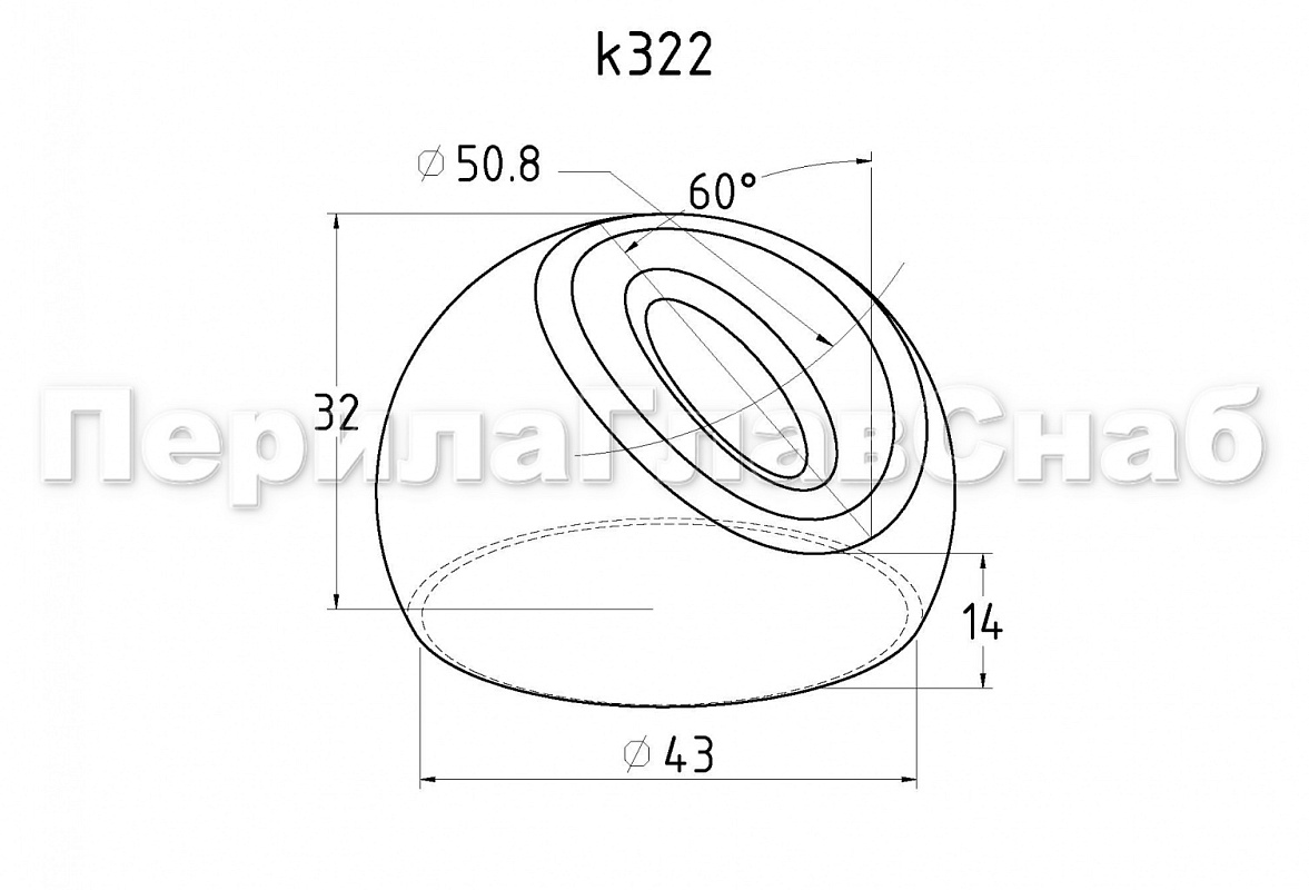 Наконечник штампованный (СПС) косой 30° на трубу Ø42.4 мм, для поручня Ø50.8 мм, полированный, нержавеющий, AISI 304, k322