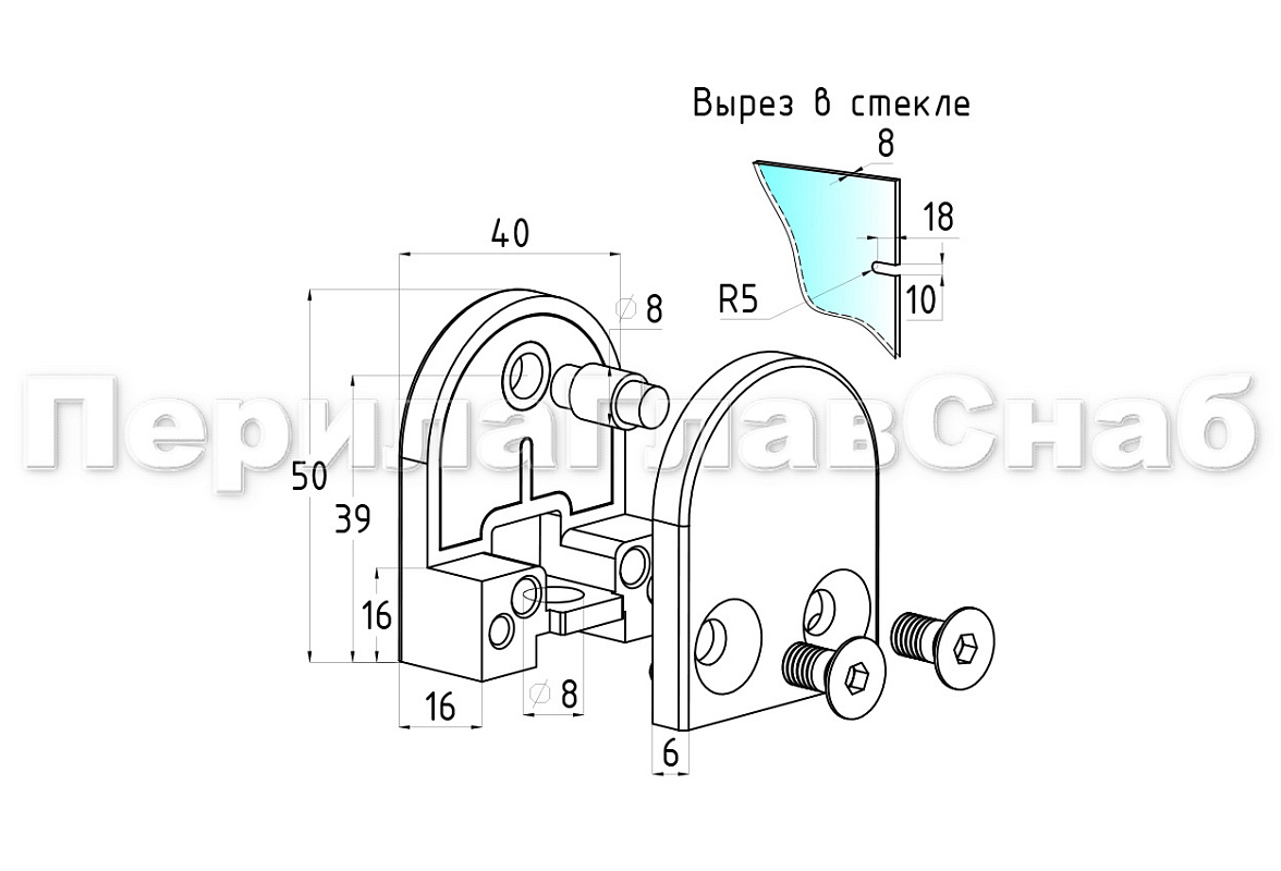 Предназначен для установки на плоскость самосборного или сварного ограждения. Стеклодержатель подготовлен для зажима стекла толщиной  8-10 мм и для триплекса 4+4 мм. В комплект входят дополнительные вставки под стекло 8 мм, 4+4 мм. Если у вас стекло толщиной 10 мм, то дополнительные вставки не используют. Также в комплект входит стеклоуловитель для стекла, данный стеклоуловитель, при монтаже можно не использовать. По умолчанию, литой стеклодержатель рассчитан на нагрузку до 40 кг, стекло со временем не поползет. Если вам необходимо увеличить нагрузку на стеклодержатель до 50 кг, то в таком случае, используют стеклоуловитель и в стекле согласно чертежу, делают отверстие. Данный стеклодержатель  используют под плоскость.