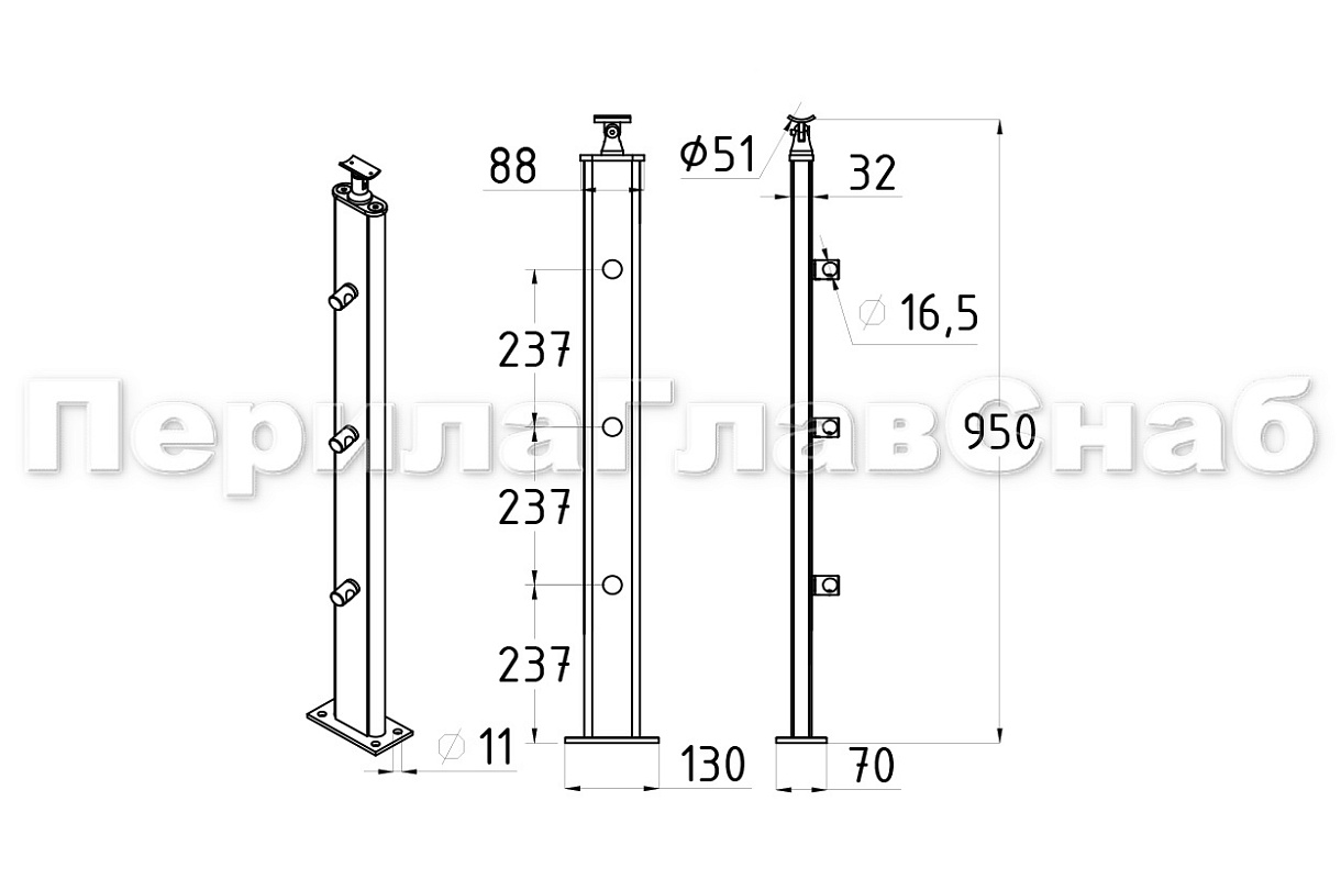 Стойка квадратная 40х40: 4 литых стеклодержателя, шлифованная, высота 950 мм AISI 304 k746-7 купить в Красноярске