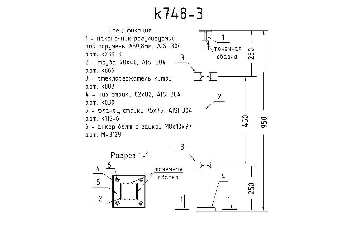 Стойка квадратная 40х40: 4 литых квадратных стеклодержателя, шлифованная, высота 950 мм, марка стали- AISI 304
