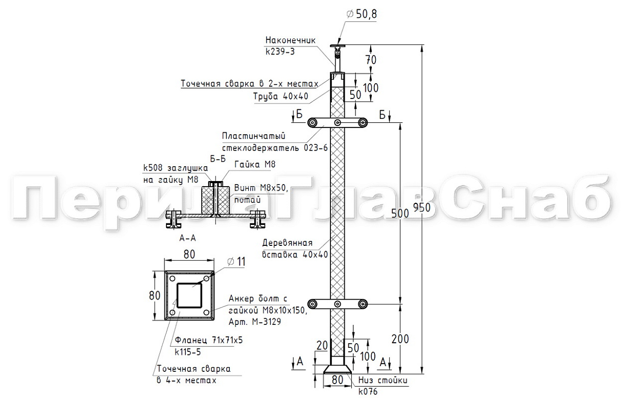 Готовая стойка 40х40х950 мм, деревянная, со вставками из нержавеющей стали 2х100 мм с 3 ригеледержателями k740-1-G купить в Красноярске