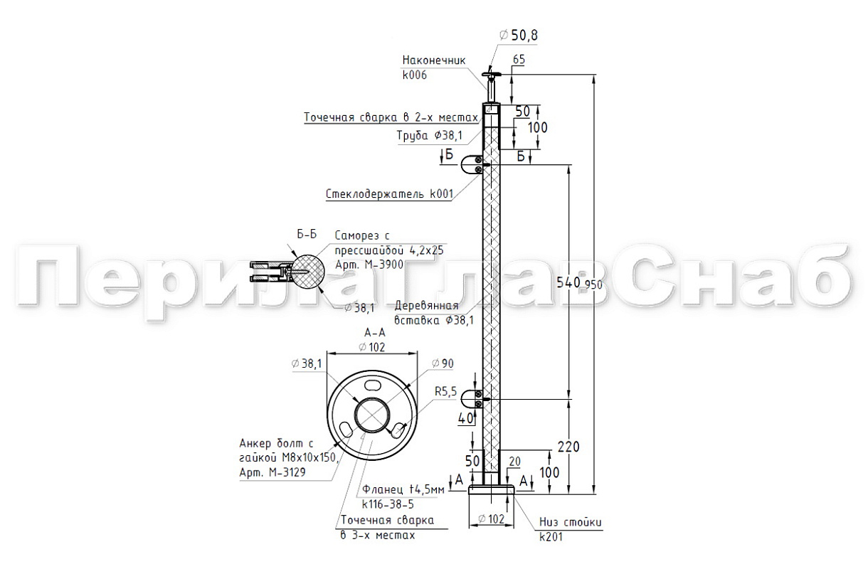 Готовая стойка Ø38,1 мм, с фланцем и наконечником, высота 950 мм, полированная (AISI 304) k702 купить в Красноярске