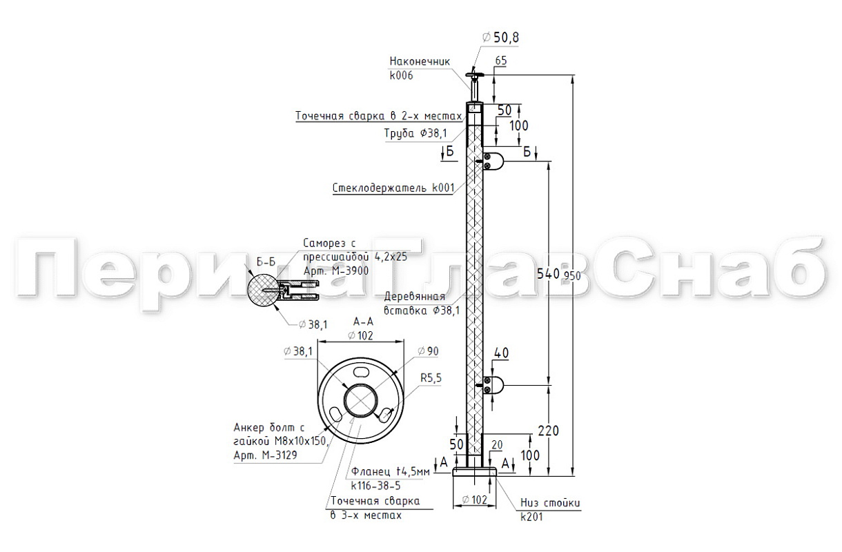 Готовая стойка Ø38,1 мм, с фланцем и наконечником, высота 950 мм, полированная (AISI 304) k702 купить в Красноярске