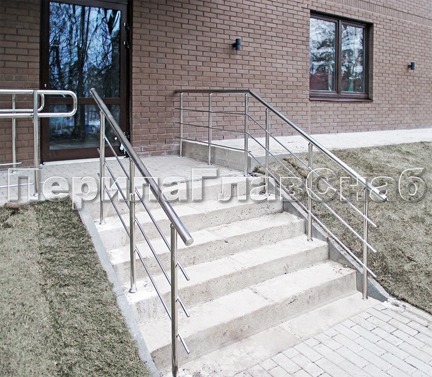 Устанавливались 3-х ригельные ограждения. Ригели на двойном сварочном шве (антивандальное крепление). Стойки и поручень ограждений входных групп из нержавеющей трубы AISI304. При изготовлении использовалась труба специально для перил и ограждений: со специальной улучшенной рецептурой (больше легирующих добавок, меньше углерода), идеальная полировка.