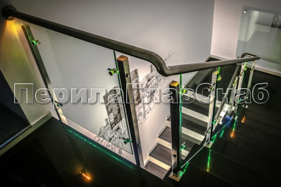 Наиболее эффектно смотрится одновременно два вида подсветки: подсветка поручня и подсветка стоек.