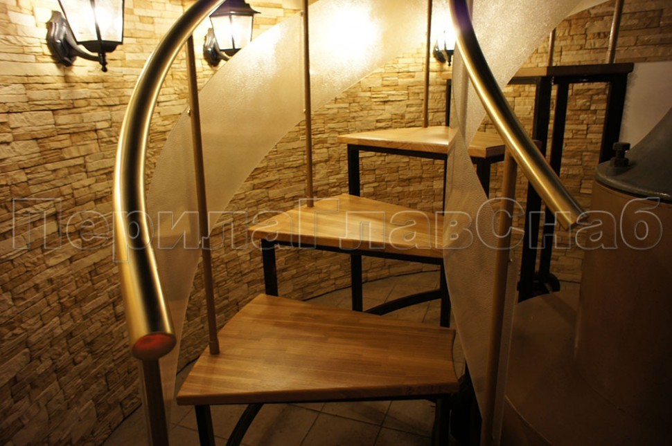 - Ограждение лестницы с прозрачным стеклом, стойками и поручнем из латуни