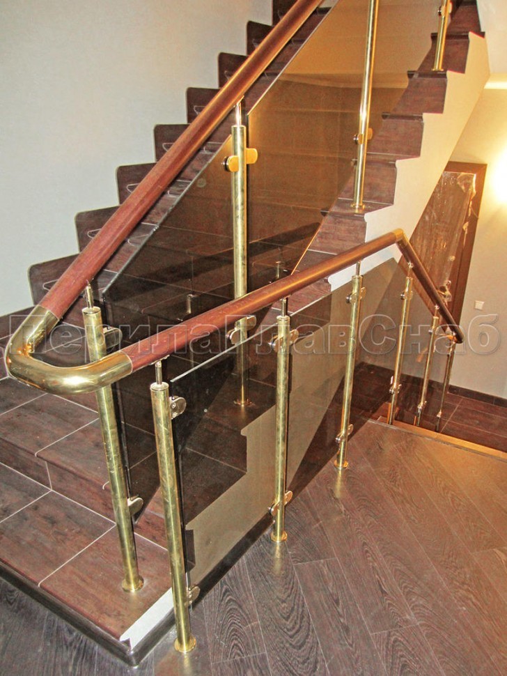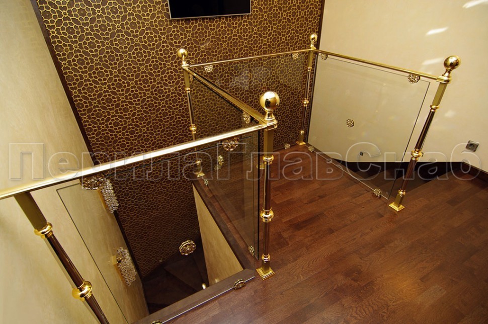- Ограждение лестницы со стеклом, тонированным в массе, стойки и завязки поручня из латуни